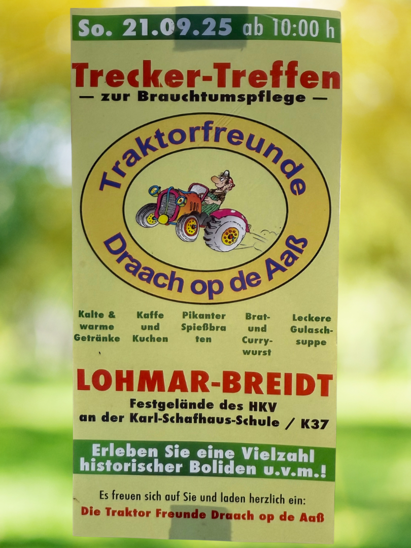 Am Sonntag, den 21.09.2025 ab 10:00 Uhr laden die Traktorfreunde „Draach op de Aaß“ zum großen Trecker-Treffen zur Brauchtumspflege ein.